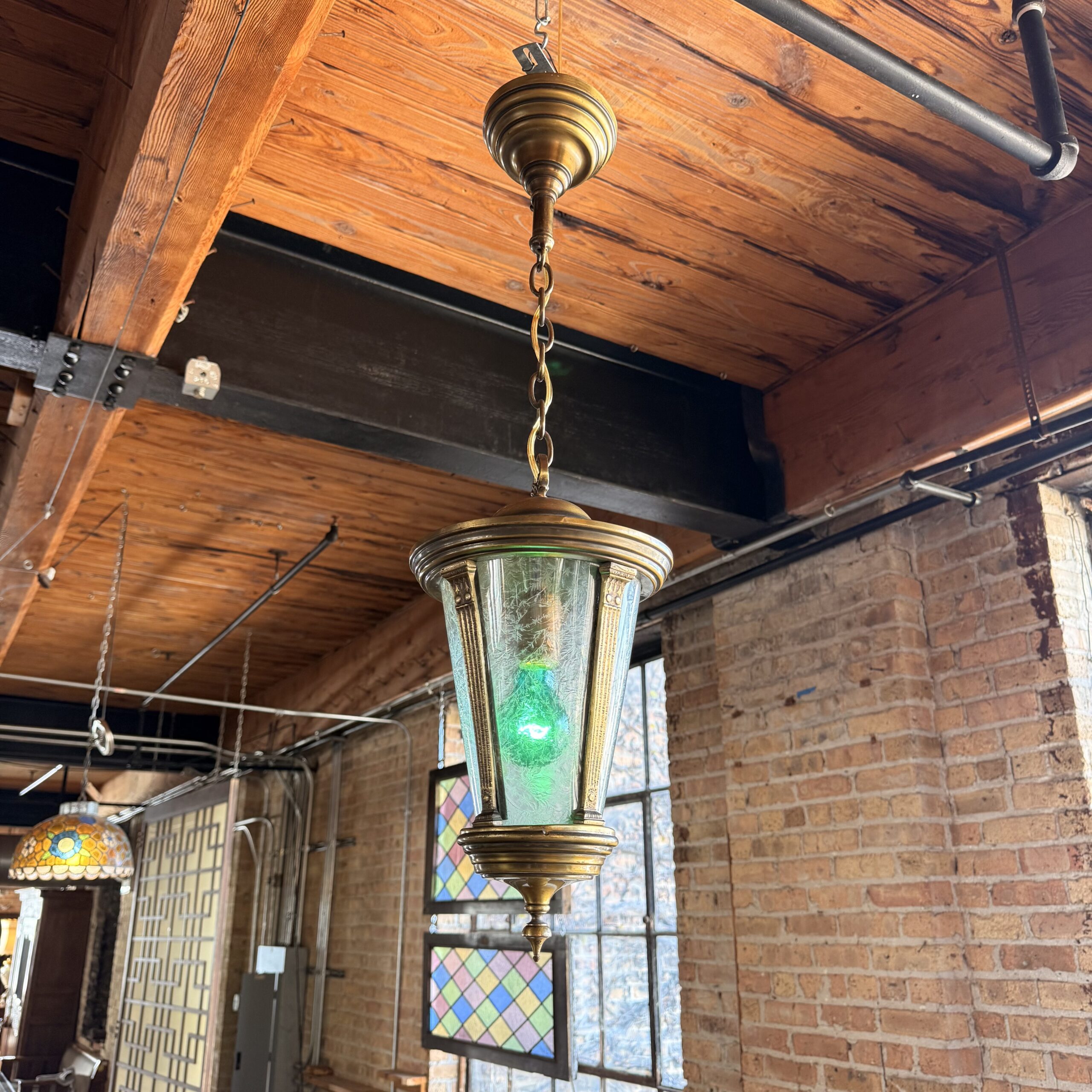 1 Light Brass w Decorative Columns & Feathered Glass Hanging Light